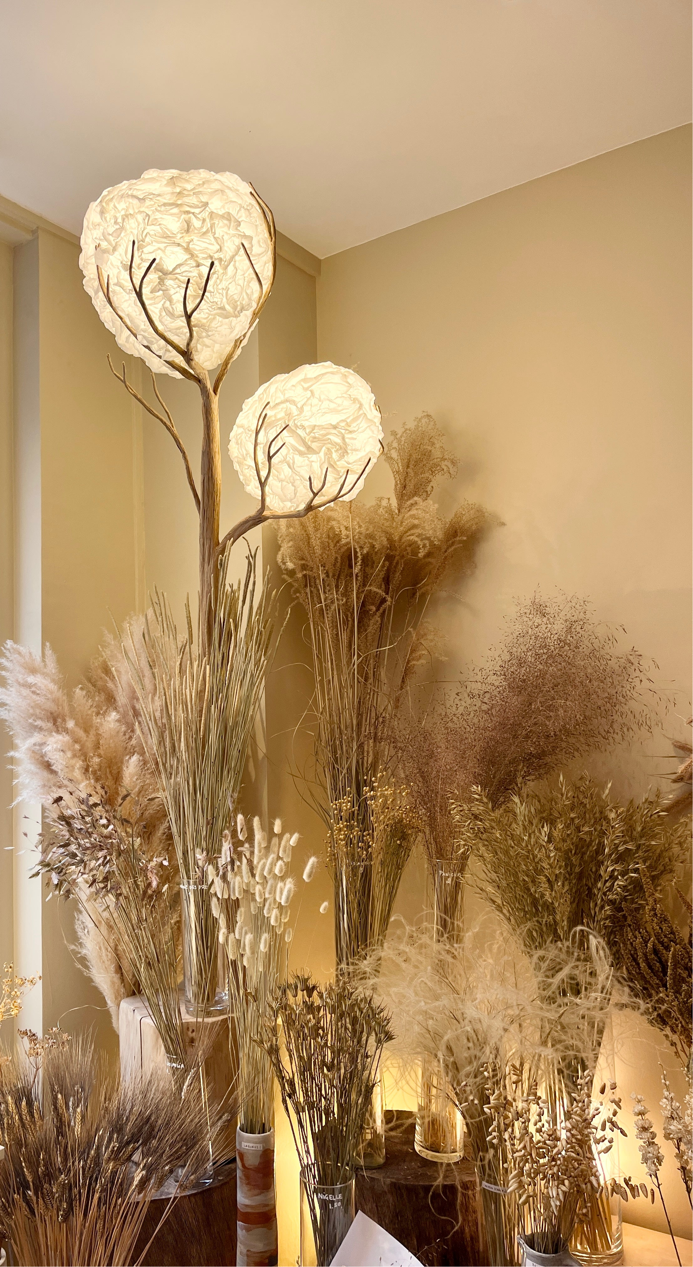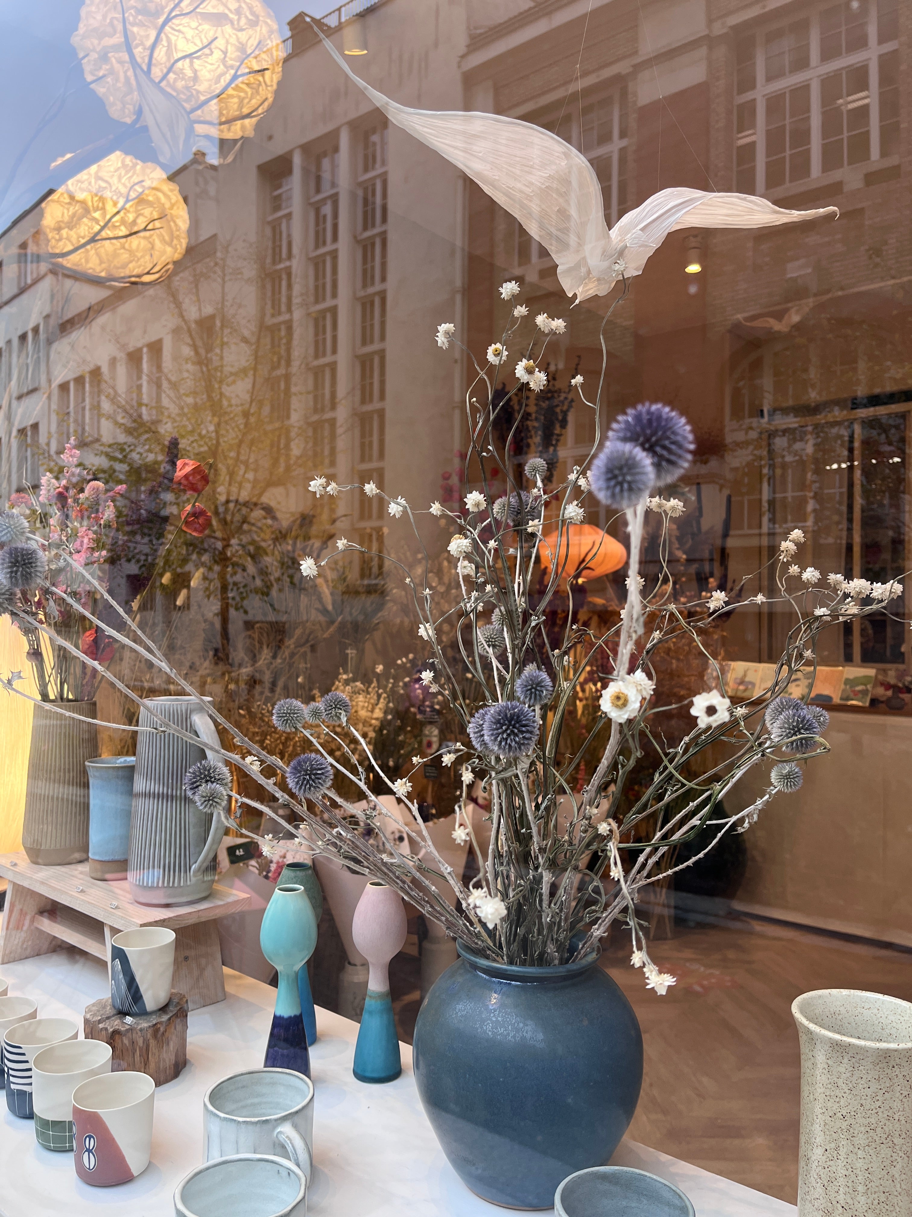 Dans la première boutique, vous trouverez notre assortiment de fleurs séchées, toute la partie décoration (vases, bougies,...), l'art de la table, la cuisine et les lampes.